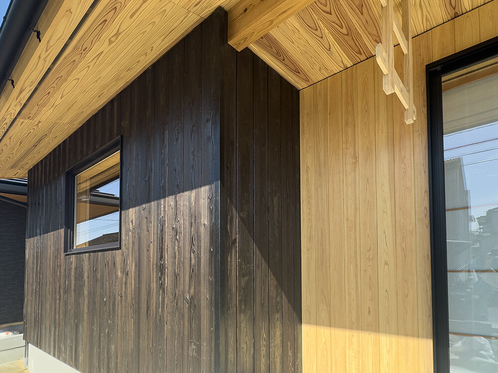 住まいの顔となる外壁には、伝統的な技法で仕上げた「焼杉」を使用。深みのある表情と深い耐久性で。時間を重ねても味わい深い佇まいが魅力。