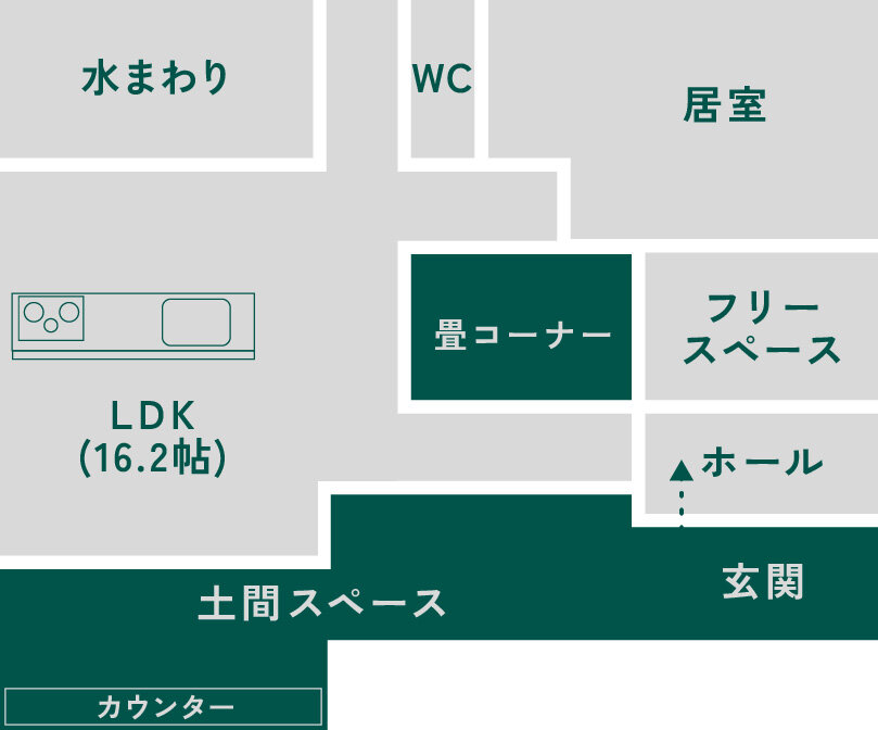 24坪の中に、広々としたリビング空間、十分な収納、フリースペースを詰め込みました。リビングと土間が自然につながり、数字以上の広がりを感じられる空間設計。