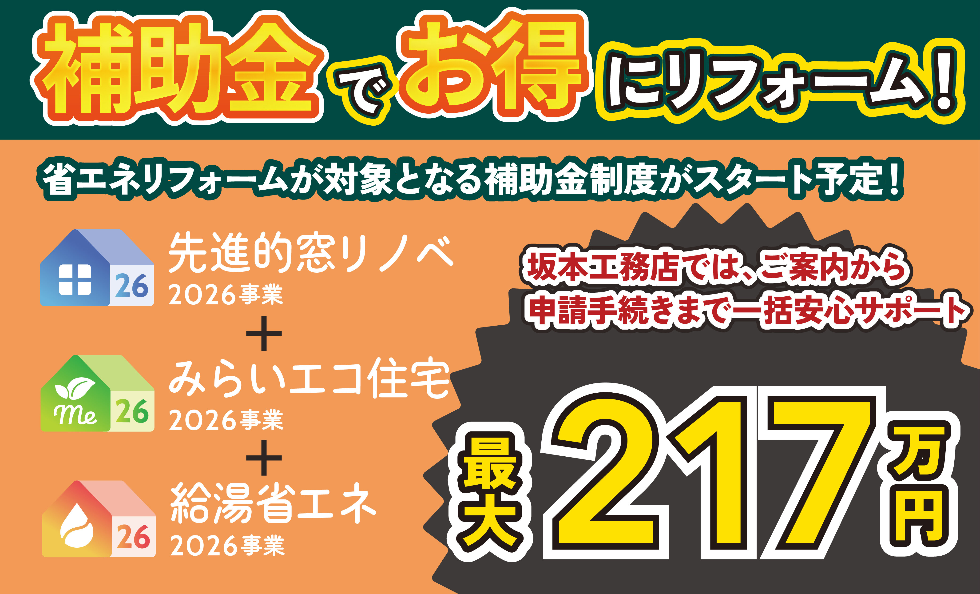 坂本工務店では、補助金のご案内から申請手続きまで一括してサポートいたしますので、はじめての方でも安心してご利用いただけます。