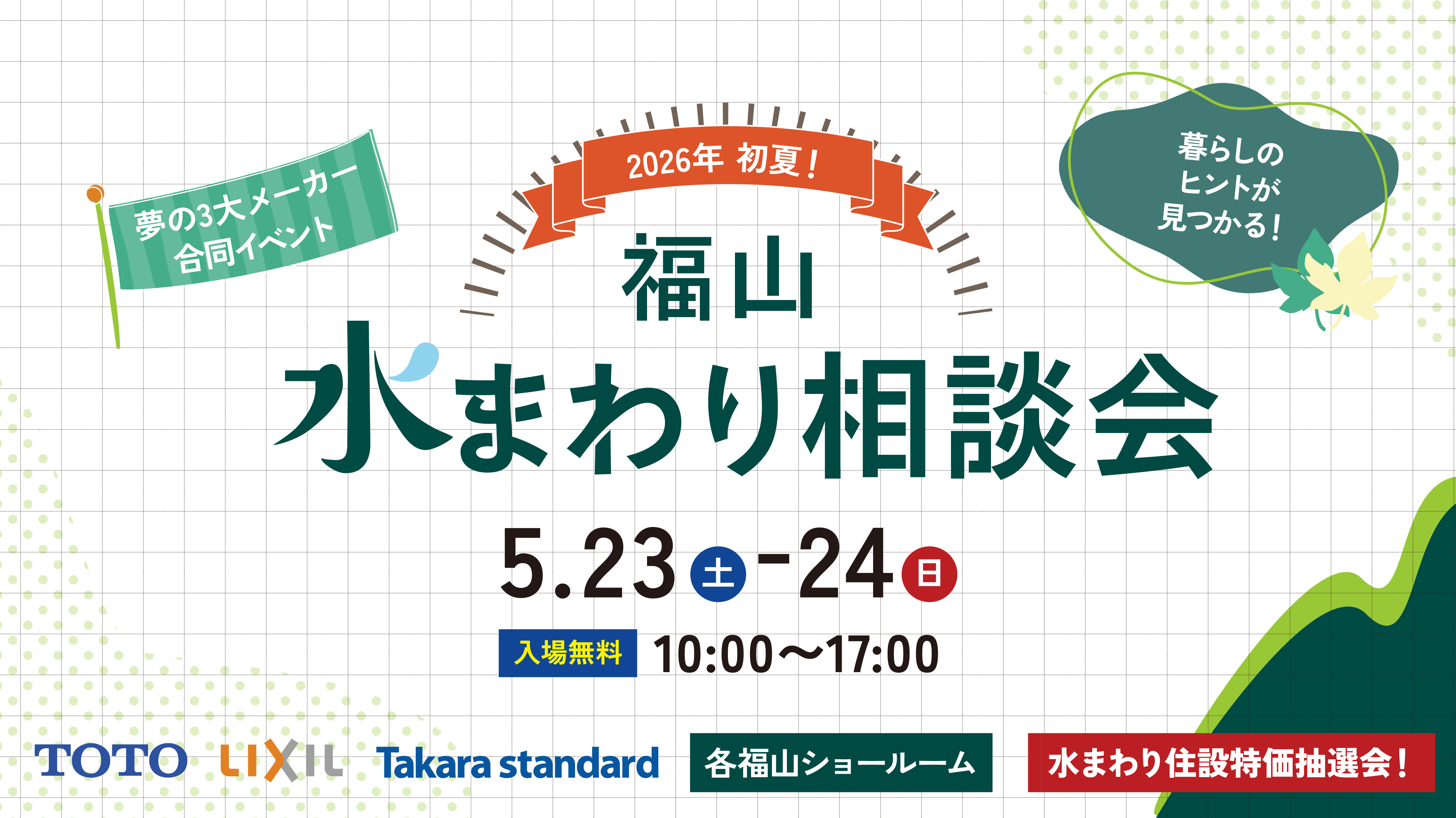 この度、坂本工務店では5月23日(土)〜24日(日)にTOTO、LIXIL、タカラスタンダードの各福山ショールームにて、水まわり相談会を開催いたします。