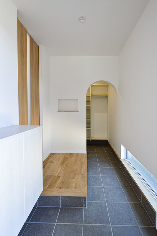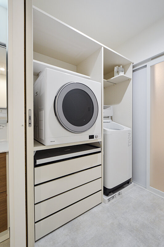 洗濯動線にもこだわり、乾太くんを組み込んだシステム収納を設置。乾燥後の衣類はそのままウォークスルークローゼットへ収納でき、洗濯から片付けまでがスムーズに完結する設計となっている。家族が心地よく、機能的に暮らせる工夫を随所に散りばめた一棟。