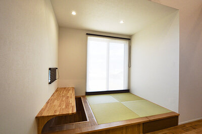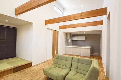 リビングは勾配天井と化粧梁、暖かな光が差し込む天窓が印象的で、視線が抜けることで心地よい開放感を生み出している。畳の小上がりは、家族のスタディースペースとして活躍し、キッチンからも目が届くため家事をしながら子どもを見守ることができる安心の配置。