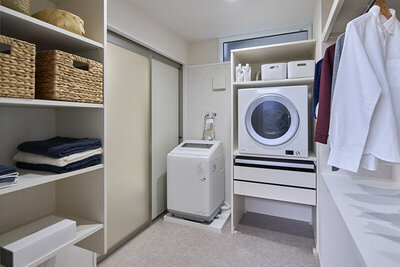 水回りも2階に集約し、乾太くん収納、物干しスペースを備えた広々とした脱衣室を設けることで、家事動線を短縮し、日々の負担を軽減しています。建て替え前のお住まいでは、日当たりの悪さや湿気、寒さに悩まされていましたが、限られた敷地条件の中でも光を取り込み、のびのびと暮らせるよう、収納計画や動線に工夫を凝らした設計が見どころ。